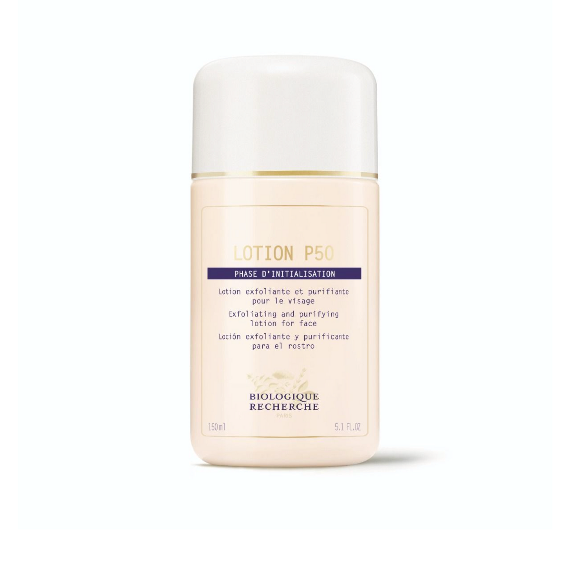 Lotion P50 by Biologique Recherche is a multifunctional lotion that exfoliates, cleanses, and purifies the epidermis, helping it maintain its acidic pH balance.